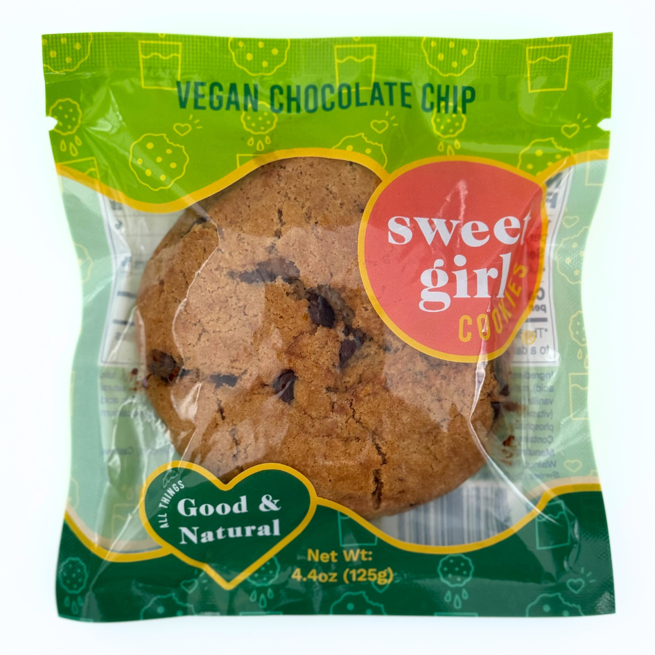 All that you love about Sweet Girl Cookies now in a VEGAN Chocolate Chip version. This cookie is packed with dark chocolate chips combined with coconut oil and applesauce for moist, cakey treat. Each of our delicious BIG cookies weigh in at almost 4 1/2 ounces! All Sweet Girl Cookies are individually wrapped.