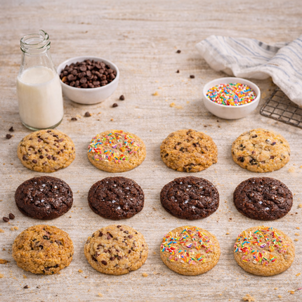Choose from an assortment that includes Chocolate Chip, Dark Chocolate Sea Salt, Lemon Blueberry White Chip, Rainbow Sprinkle Sugar, Oatmeal Raisin and Snickerdoodle or select just your favorite flavor.