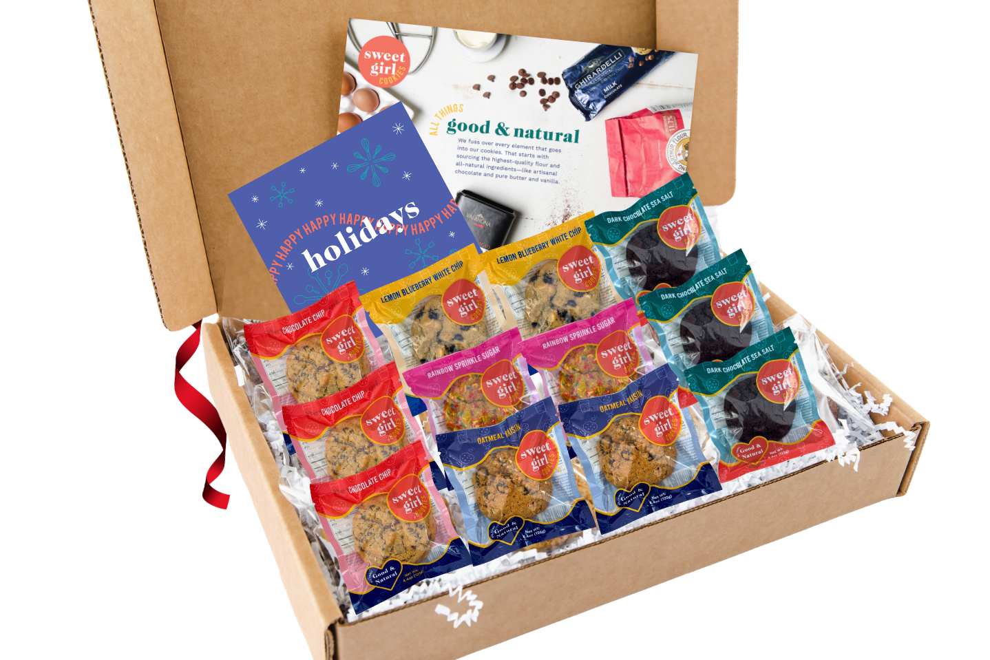 Our classic size almost 2-ounce cookies and you pick your flavors! Mix and match for a custom assortment + a special Holiday card.
